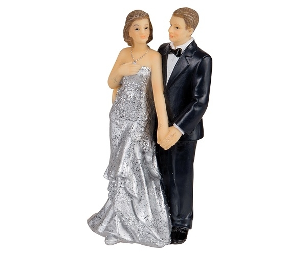 Diese Kuchendeko ist speziell für die Silberhochzeit gedacht. Der Herr trägt einen dunklen Anzug und die Silberbraut selbstverständlich ein elegantes silberfarbenes Kleid.