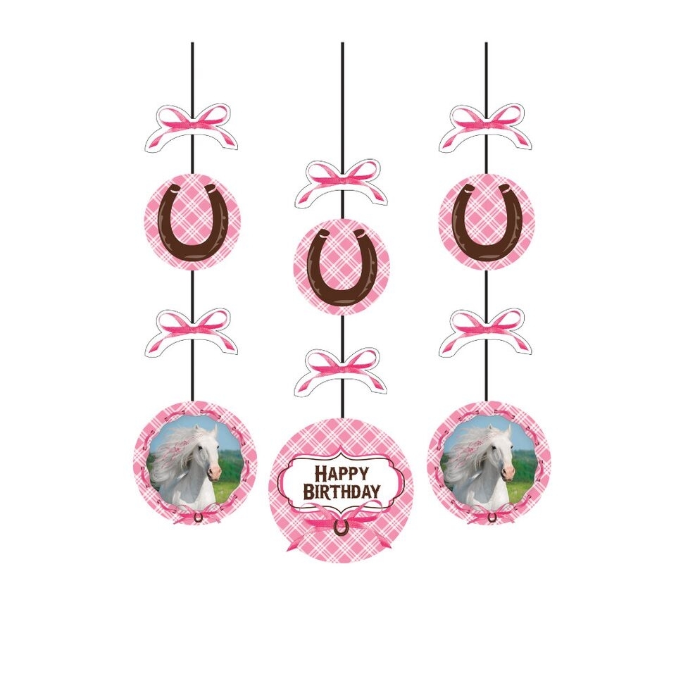 Ein beliebtes Motiv für Mädchengeburtstage sind die Pferde. Sie bekommen drei Hängedekos mit jeweils einer Schleife, einem Schildchen mit Hufeisen und einem Schildchen mit Happy-Birthday-Druck bzw. Pferdedruck.