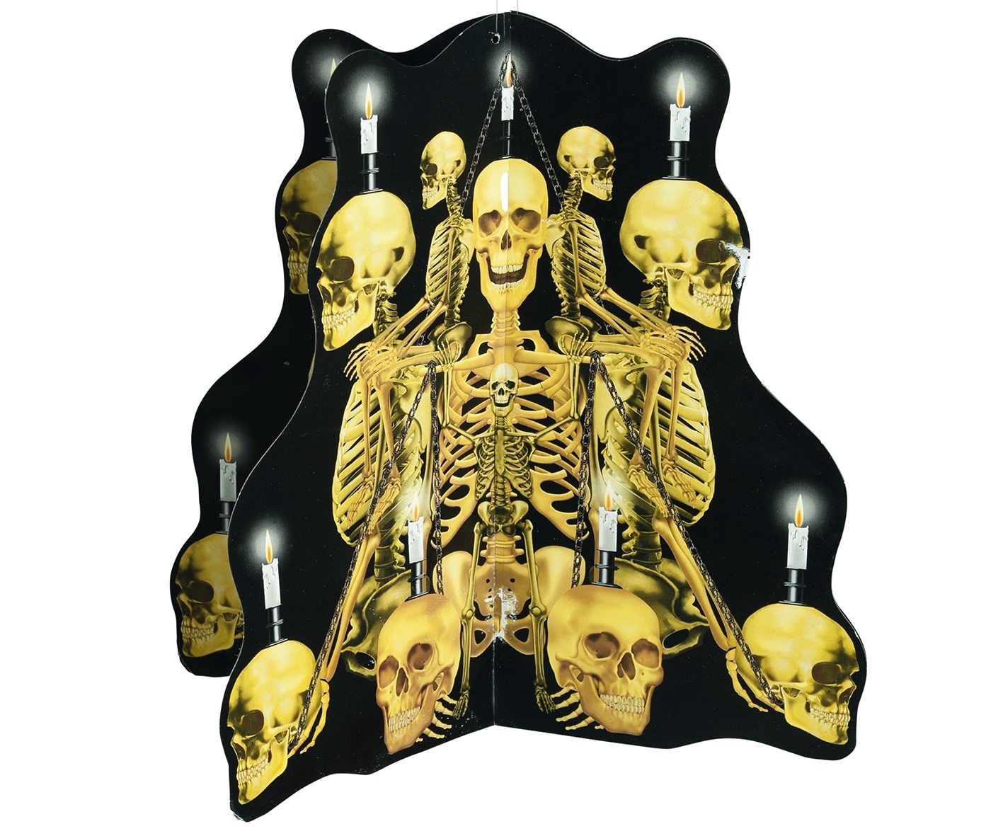 Dieser Pappaufsteller mit Totenkopf- und Skelettdruck kann toll auf den Tischen einer Halloweenparty aufgestellt werden. Für eine Raumdeko eignet er sich aber auch prima.