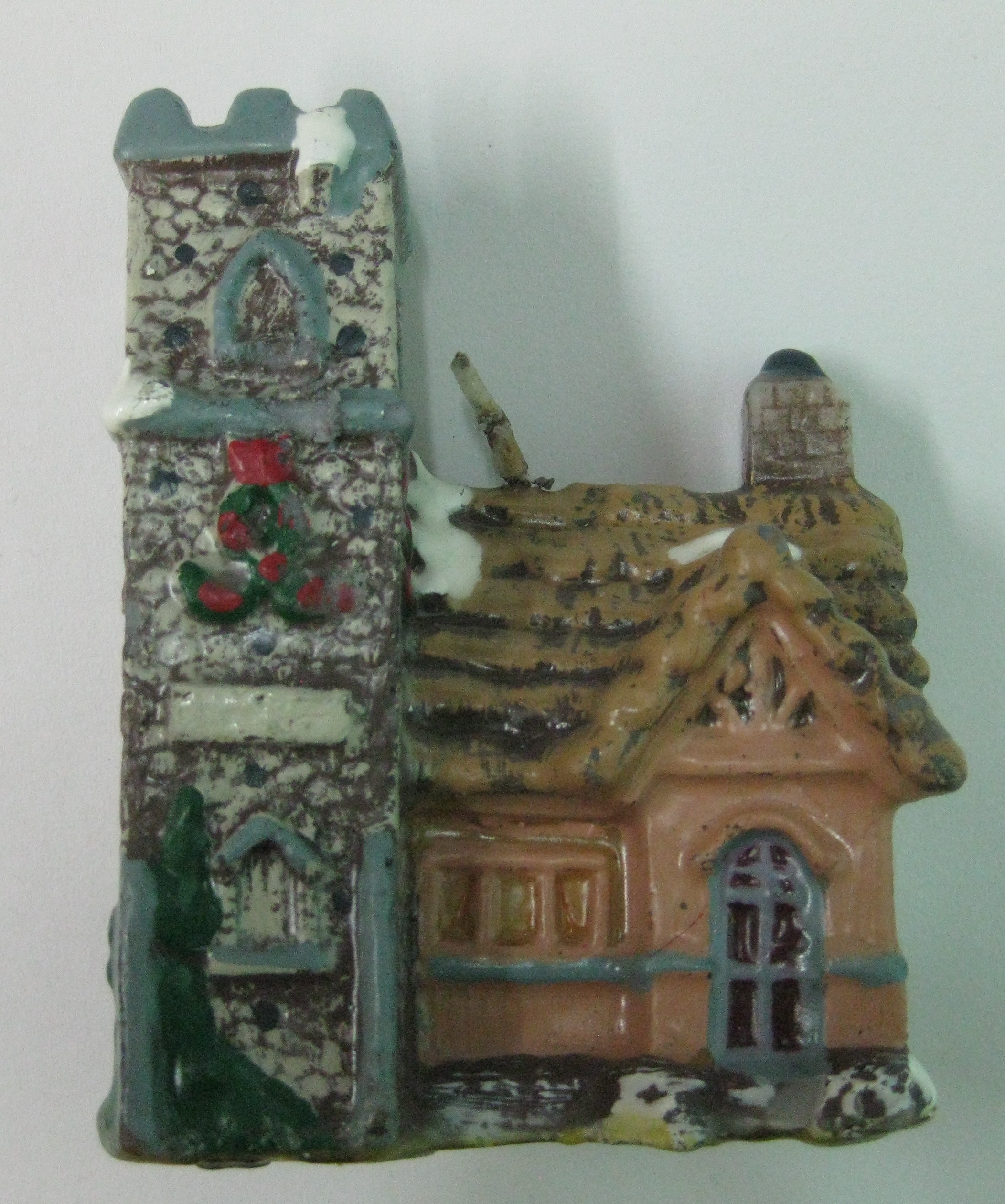 Die Kerze ist ca. 7 cm x 5 cm groß und 8 cm hoch. Der Kirchturm ist ca. 10 cm hoch.
