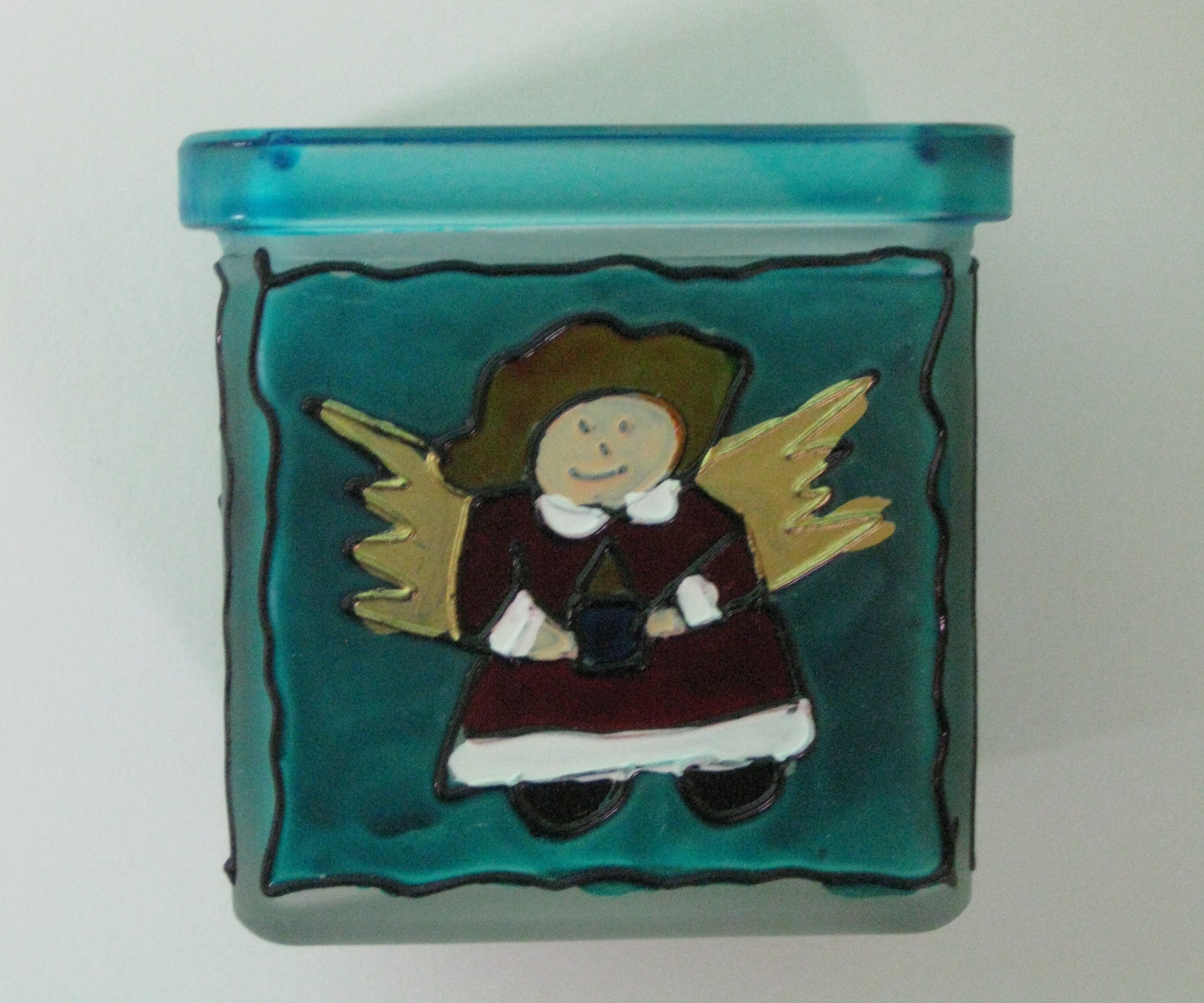 Auf dem blauen Weihnachtswindlicht aus blauem Glas befindet sich ein kleiner, niedlicher Engel, den Sie mit einem Teelicht zum Leuchten bringen können.