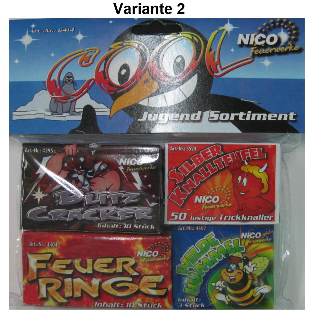 Das Jugendsortiment "Cool" enthält jeweils 4 beliebte Jugendfeuerwerke. Sie können zwischen 2 Varianten wählen.