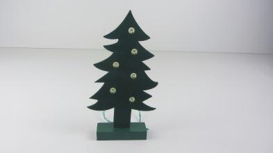 Der Filz-Tannenbaum ist ca. 21 cm hoch und hat 6 kleine LED-Birnchen. Damit der Tannenbaum auch eine gute Standfestigkeit aufweist, steht er auf einem kleinen grünen Holzfuß (ca. 9 x 3,5 x 2 cm). Die Beleuchtung ist batteriebetrieben, die Batterien gehören nicht mit zum Lieferumfang.