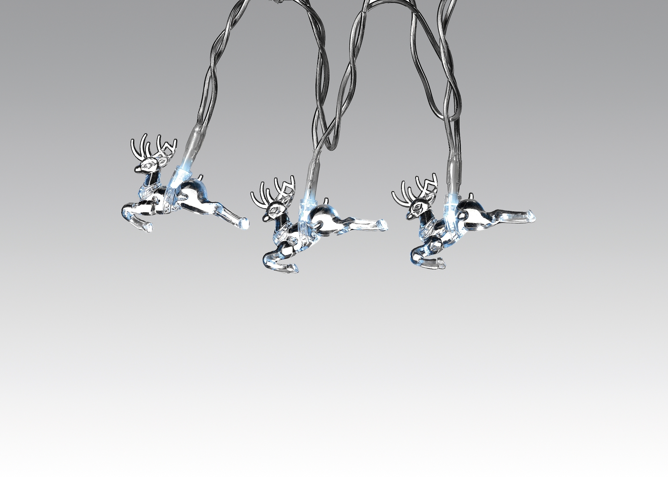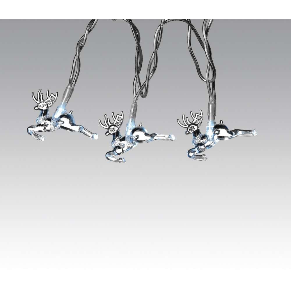 Diese Lichterkette hat eine transparente Zuleitung mit 20 weißen LED-Birnchen. Die Lichterkette ist insgesamt ca. 2 m lang, die Zuleitung ist bis zum 1. Rentier ca. 1,40 m lang. An die 20 Birnchen wurde jeweils 1 kleines Rentier mit den Maßen: 5 x 4 cm gesteckt.