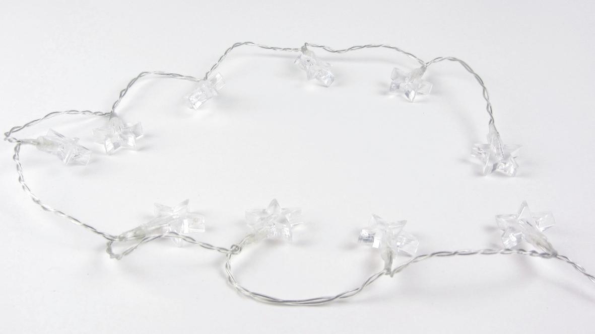 Diese Innen-Mini-LED-Lichterkette hat auf den Birnchen kleine transparente Sternchen (Durchmesser: 3 cm). Die Lichterkette ist insgesamt 1,20 Meter lang, die Zuleitung bis zum 1. Stern sind 90 cm. Die Lichterkette ist batteriebetrieben, hierfür benötigen Sie 2 AA-Batterien LR6 - 1,5 Volt. Die Batterien sind nicht mit im Lieferumfang enthalten.