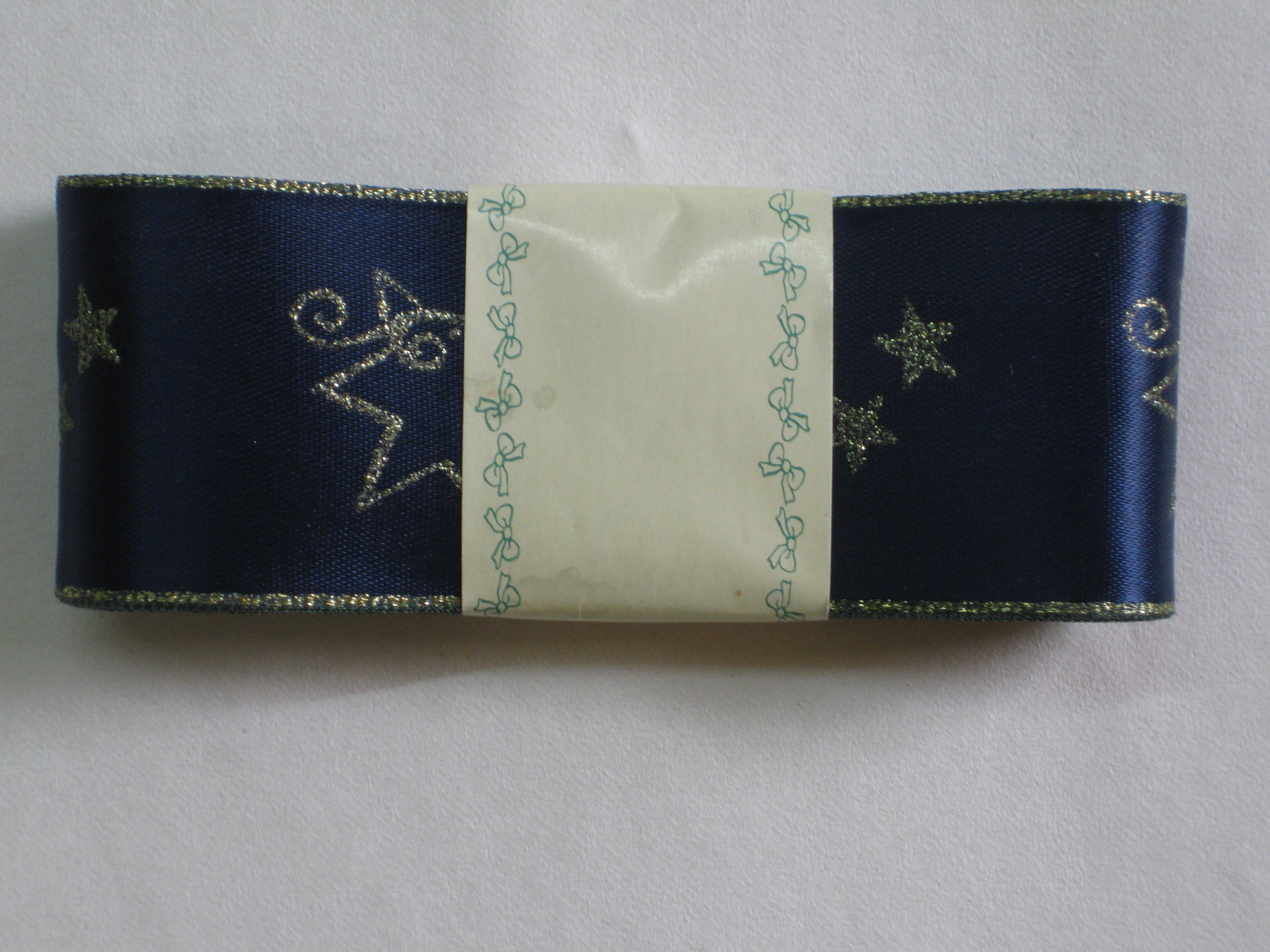 Das Geschenkband mit Weihnachtsmotiv ist 40 mm breit und 2 m lang. An den Rändern befindet sich eine Goldkante und auf dem Band finden Sie goldene Sterne.