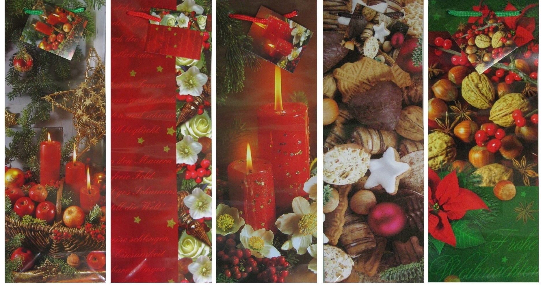 Diese Weihnachts-Flaschentaschen sind etwas breiter und somit auch für Sektflaschen gut geeignet. Alle Lacktragetaschen haben eine passende Kordel zum Tragen und ein Geschenkekärtchen im gleichen Design wie die Tasche. Sie erhalten 10 Flaschentaschen mit 5 verschiedenen Motiven.