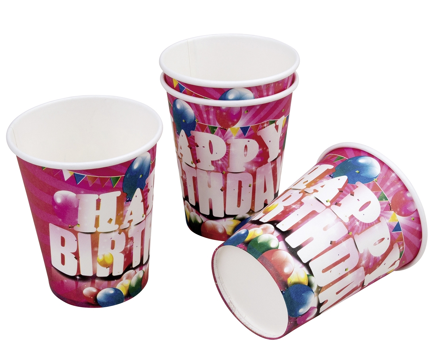 Die Einwegbecher sind aus Pappe. Auf dem rot/pinken Hintergrund ist die weiße Schrift "Happy Birthday" zu sehen umringt von Luftballons und Luftschlangen.