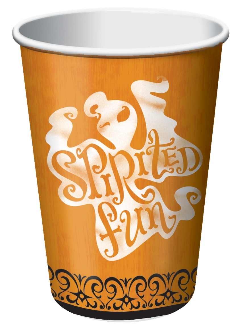 Auf den orangenen Pappbecher geistern weiße Gespenster "herum".