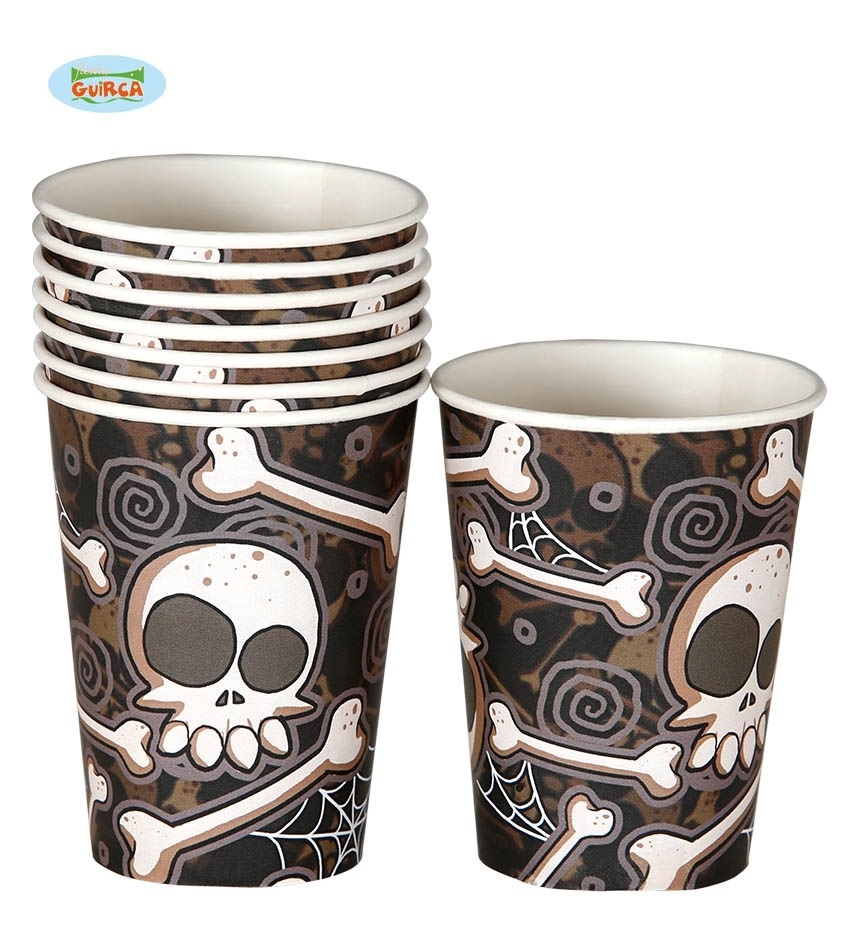 Die Einwegbecher mit dem Totenkopfmotiv sind schwarz/braun gestaltet und passen zu einer Halloweenparty genauso gut wie zu einer Piratenparty.