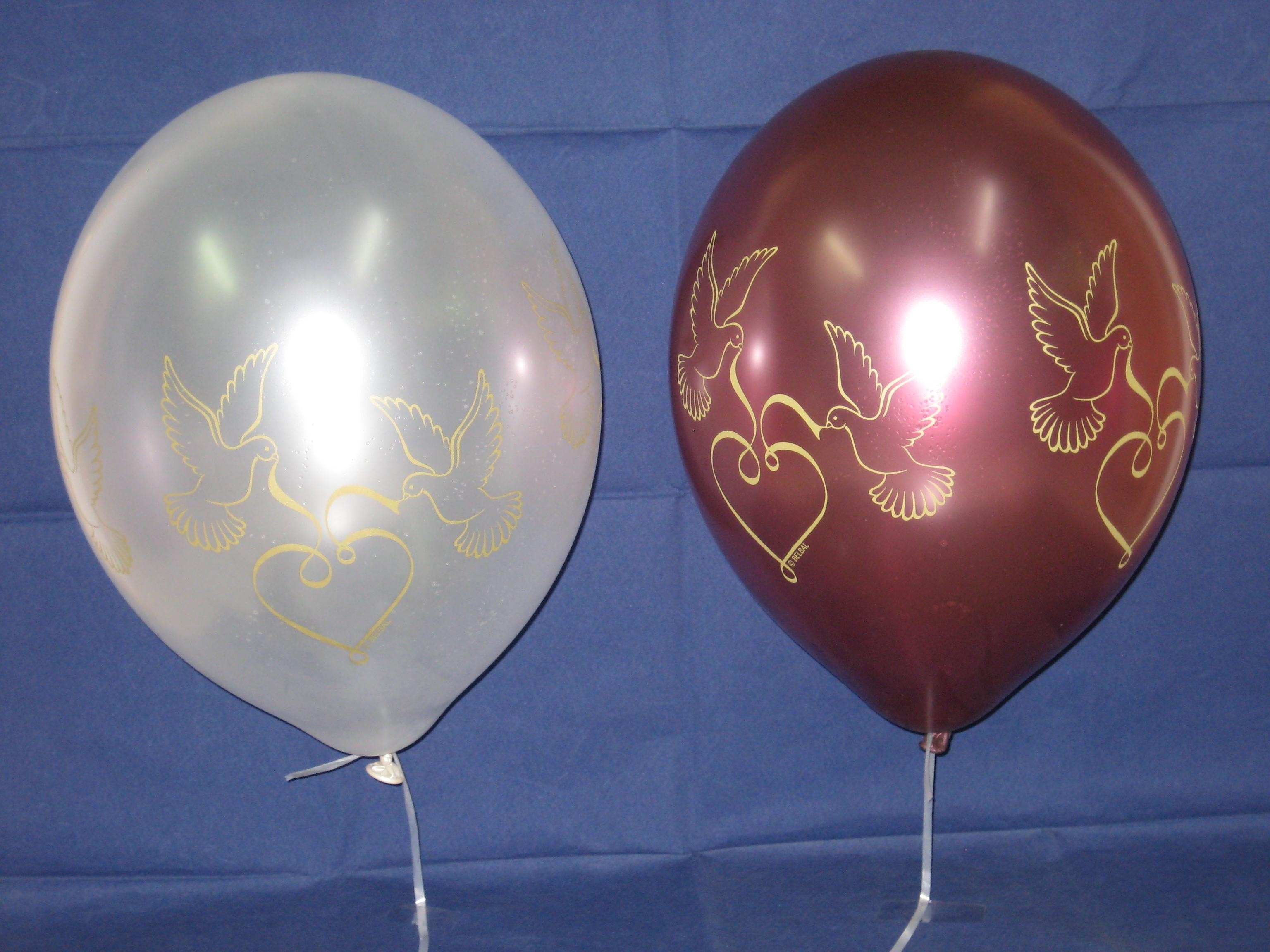 Diese tollen Metallic-Luftballons haben einen goldenen Tauben- und Herzdruck. Die Ballons sind bordeaux und weiß. Durch den edlen Druck empfehlen wir diesen Luftballon für eine Hochzeitsdeko oder eine romantische Überraschung.