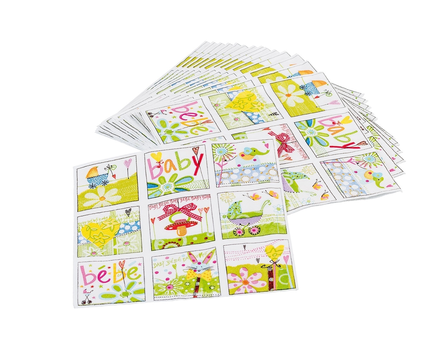 Mit diesen süßen Babyservietten kann das Babypinkeln beginnen. Die weiße Serviette ist mit vielen niedlichen Babymotiven bedruckt.Abmessung: 33 x 33 cm, 1/4-falz, 3-lagig