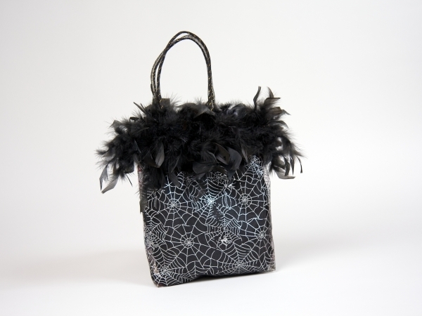 Dieses Halloweenaccesoire ist dieses Jahr einfach hipp. Die Handtasche ist schwarz mit einem schwarzen Tüll mit silbernen Spinnewebendruck uns Spinnen. Die Öffnung ist mit einer schwarzen Federboa verziert. Die Tasche hat zwei schwarz/goldene Träger in der Länge von 20 cm. Die Tasche ist 30 cm hoch und 20 cm breit. Achtung: die Halloween-Handtasche hat keinen Verschluss.