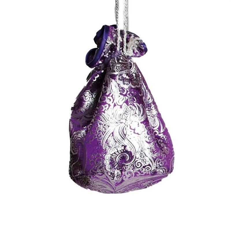 Auch eine Prinzessin muss Ihre wichtigsten Habseligkeiten gut verstaut mitnehmen. Ein lilafarbener Beutel, in Brokatoptik mit silbernen Fäden. Zum Zuziehen des Beutels ist eine Schlaufe eingenäht, die zugleich auch als Haltegriff dient.