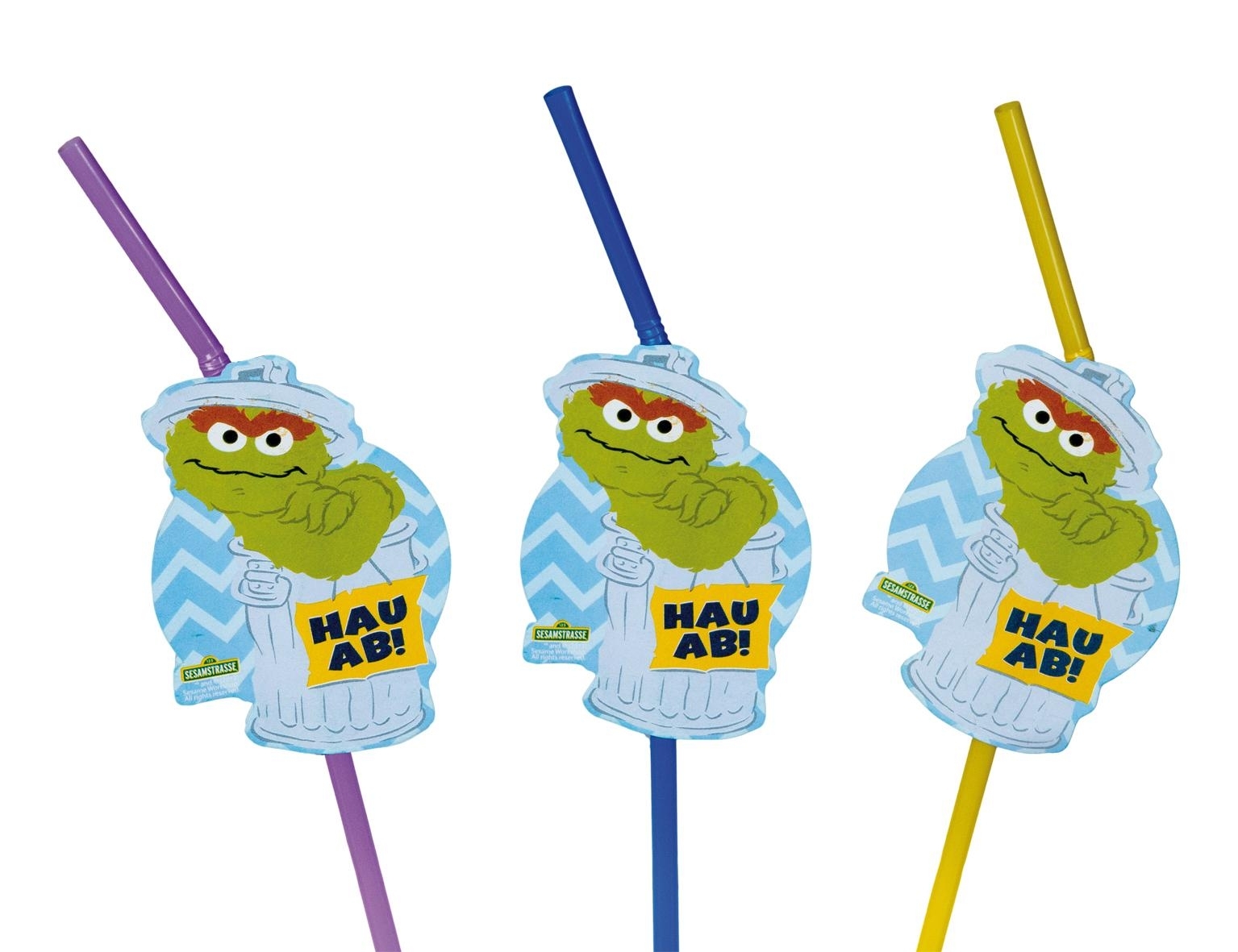 Die Trinkhalme sind knickbar und haben alle ein kleines Pappschild, auf dem Oskar aus der Mülltonne zu sehen ist. Natürlich brummig wie Oskar ist wurde nicht der Spruch Happy Birthday verwendet sondern Hau ab.