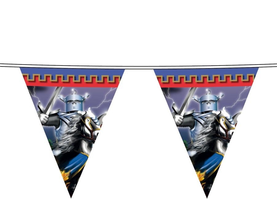 Die Ritterserie "Black Knight" ist einfach nur cool. Tapfer reitetet der schwarze Ritter auf seinem weißen Pferd durch die Nacht - selbst Feuer kann ihn nicht aufhalten. Zu dieser Mottoserie können wir Pappteller, -becher, Servietten, Luftballons uvm. anbieten. Diese schöne Wimpelkette aus Folie können Sie innen wie außen dekorieren. Auf einer Länge von 10 Metern sind 15 Wimpel angebracht. Auf jeder Seite sind 2 m Zufuhr. Ein Wimpel ist 30 cm hoch. Die Wimpelkette ist beidseitig bedruckt.