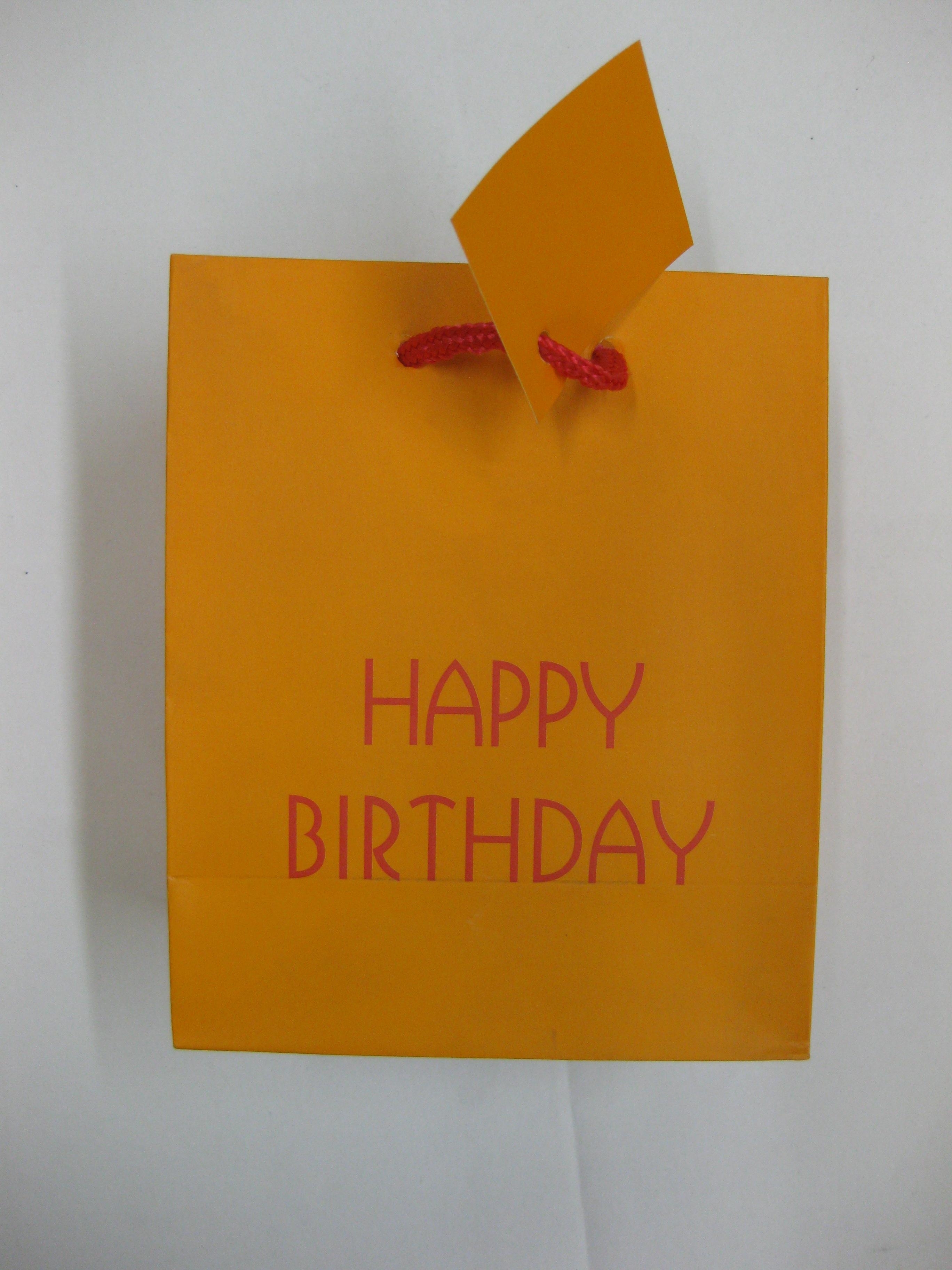 Die Geschenketasche ist aus stabilem orangenen Papier und hat einen roten Aufdruck "Happy Birthday". Die Tasche hat eine kleine rote Kordel zum Transportieren, ist 14 cm hoch, 11 cm breit und 6 cm breit. In Geschenketasche können Sie einfach, schnell und doch schön ein kleines Geschenk verpacken.