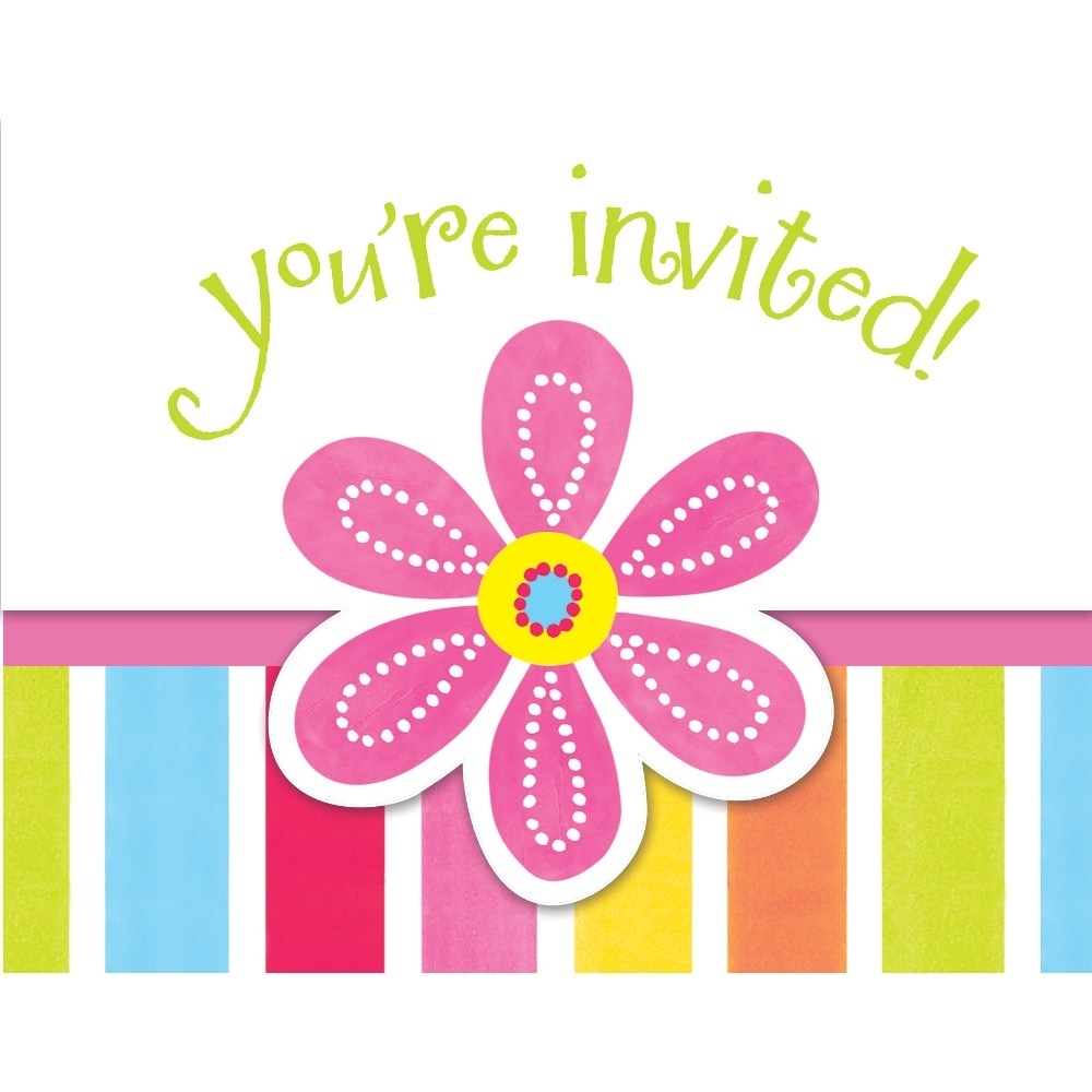 Die weißen Einladungskarten sind mit einer großen Sommerblume verziert. Am unteren Rand befinden sich grüne, blaue, rote, rosafarbende, gelbe und terracottafarbende Streifen. Über der Blume befindet sich ein grüner Schriftzug "You're invited. Der Vordruck der Einladungskarten ist ebenfalls in englisch. Zu den Karten werden passende rosafarbenden Umschläge geliefert. Eine Karte ist ca. 15 cm breit und 11 cm hoch.
