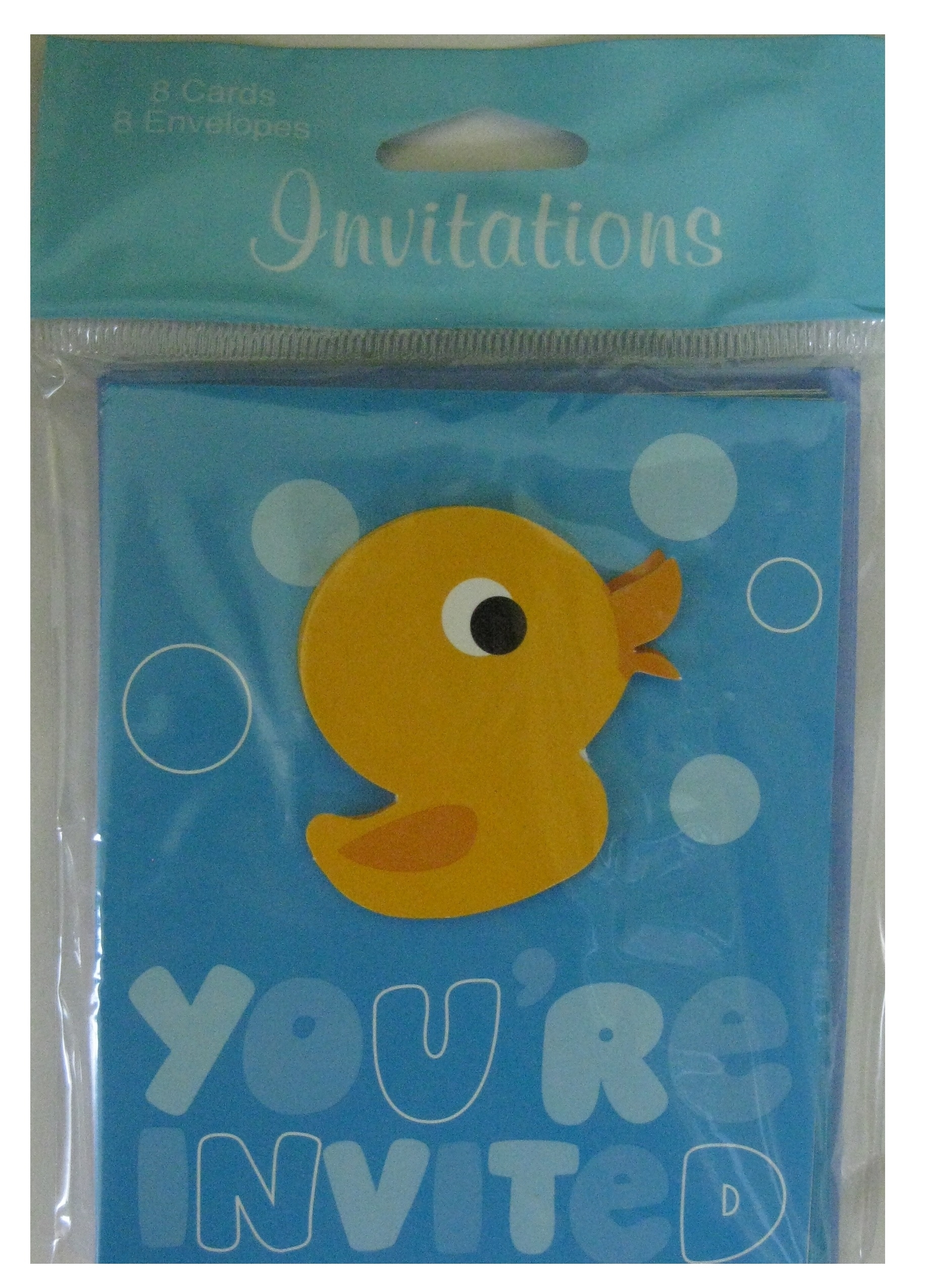 Auf den blauen Einladungen befinden sich blaue Punkte und weiße Kreise, sowie der Schriftzug "You're invited". Mit kleinen Klebepads können Sie auf jeweils 1 kleine gelbe Ente auf die Einladungskarte kleben. Die Karten sind 10 cm breit und 11,5 cm hoch. Sie bekomme 8 Karten mit den passenden Umschlägen. Die Einladungskarten haben einen englischen Vordruck.
