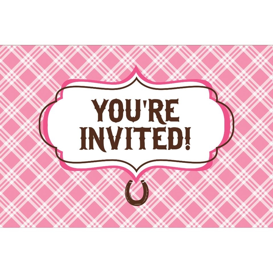 Die rosa/weiß-karierten Einladungen aus der Partyserie "weißes Pferd" haben innen einen Vordruck zum Ausfüllen und werden dann zugeklappt und einem kleinen, rosa Satinbändchen zugebunden. Zu den raffinierten Karten werden passenden rosa Umschläge mitgeliefert.