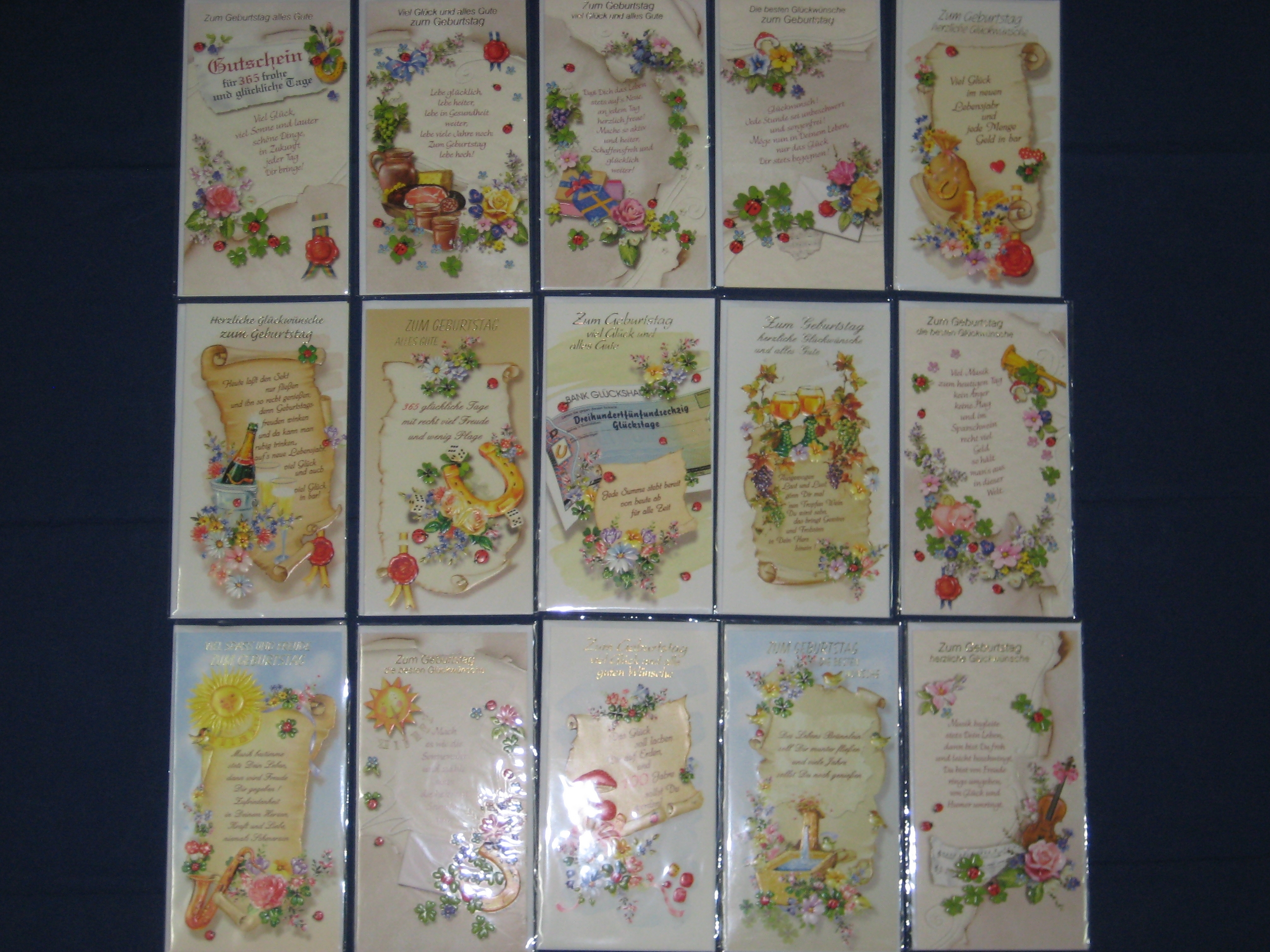 Die Grußkarten haben alle einen Glückwunschspruch und ein ansprechendes Motiv sowie einen Goldprägung. Es gibt 15 verschiedene Motive. Die Karten werden natürlich mit passendem weißem Umschlag geliefert. Die Karte ist 11,5 cm breit und 17 cm hoch.