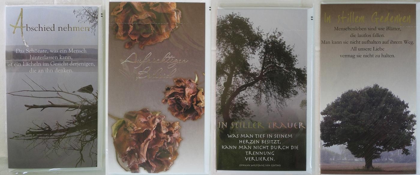 Die Trauerkarten sind alle mit einer Silberprägung versehen. Es gibt verschiedene Motive teils mit Beileidssprüchen. Diese Karten werden natürlich mit weißem Umschlag mit schwarzen Trauerstreifen geliefert. Die Karten sind 10 cm breit und 17 cm hoch.