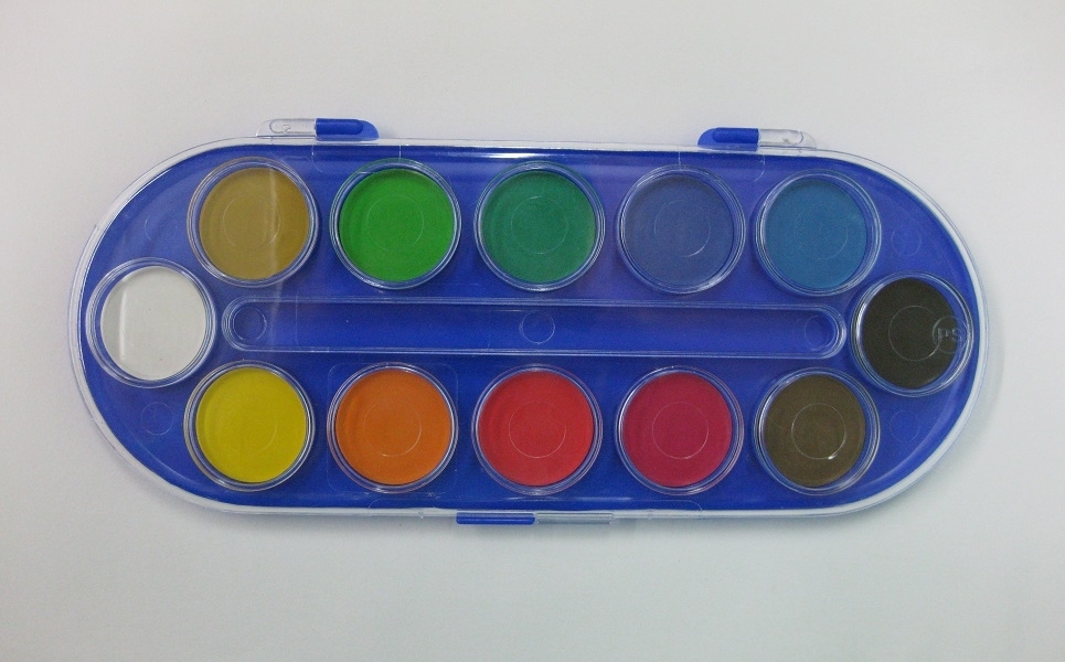 Dieser Farbkasten beinhaltet 12 Farben. Zwischen der oberern und unteren Farbreihe können Pinsel aufbewahrt werden. Ein passendes Schulpinselset können Sie auch bei uns finden.