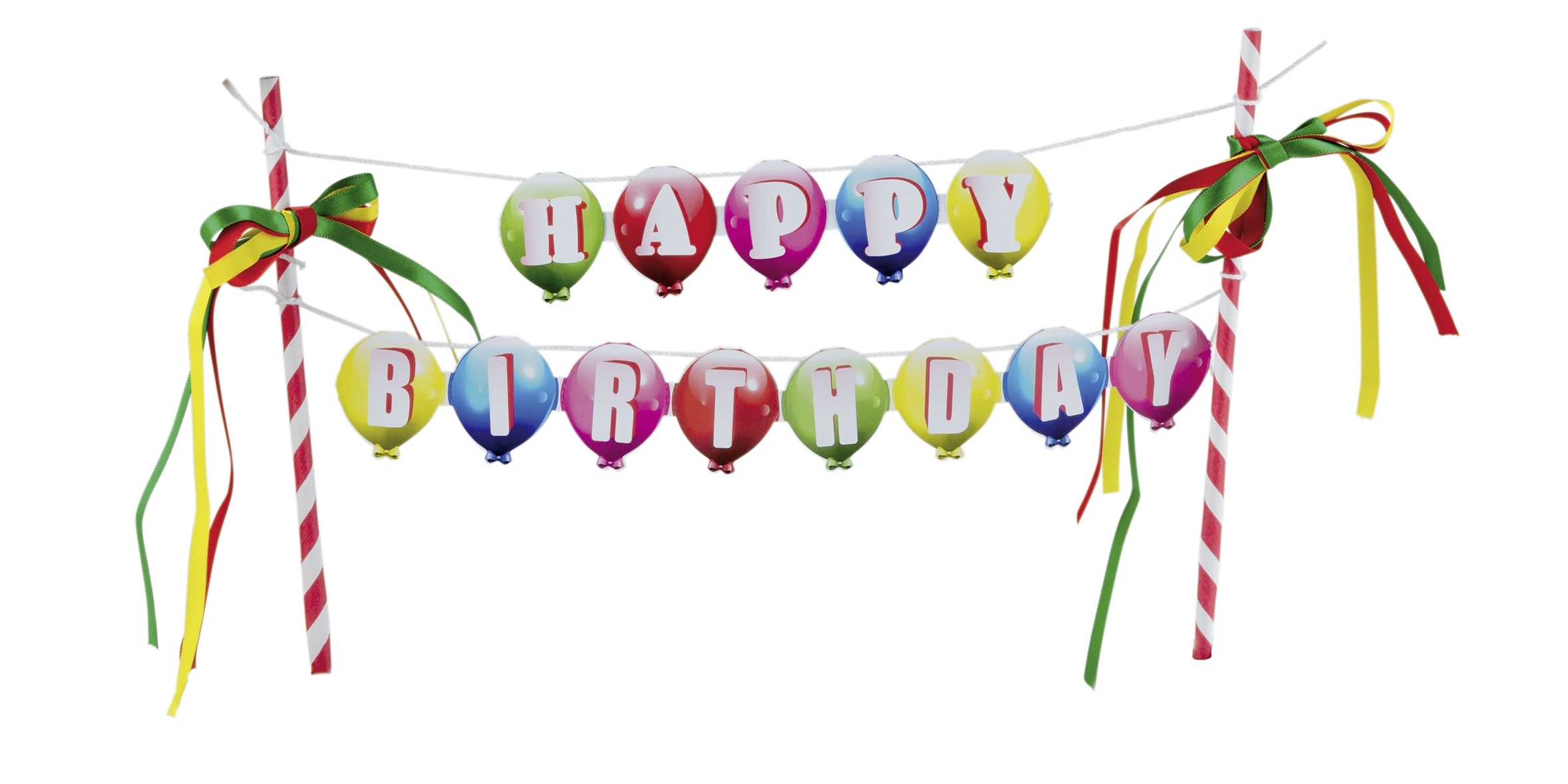 Die Kuchendeko "Happy Birthday" ist bunt gestaltet. Über zwei Schaschlickspieße werden rosa/weiß-gestreifte Röhren gesteckt. Hier ran werden zwei Fäden befestigt. Über diese können die vorgestanzten Schriftzüge Happy und Birthday gehangen werden. An den Röhrchen können noch zusätzlich Satinabänder befestigt werden.