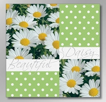 Hellgrün ist eine sehr schöne Frühlings- und Sommerfarbe. Diese sommerlichen, hellgrünen Servietten sind mit Margeritten bedruckt.Abmessung: 33 x 33 cm. 3-lagig, 1/4-falz