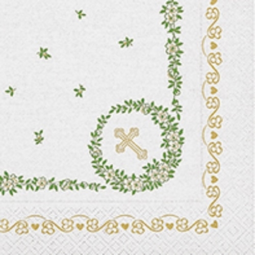 Auf der weißen Serviette confirmation befindet sich rundum ein goldfarbener Bordendruck, gefolgt von grüner Myrthe, diese befindet sich auch in der Mitte der Serviette. Auf der Ecke befindet sich in einem Myrtenkranz ein goldfarbenens Kreuz.