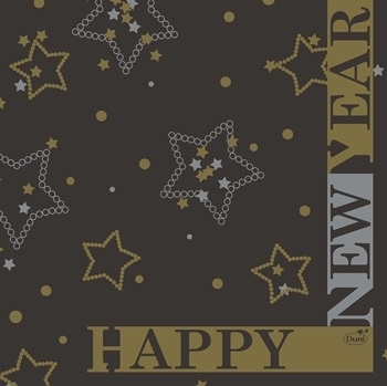 Auf der schwarzen Silvesterserviette sind goldene und silberne Sterne und ein gold/silbernen Schriftzug "Happy New Year" - Black is beautiful.