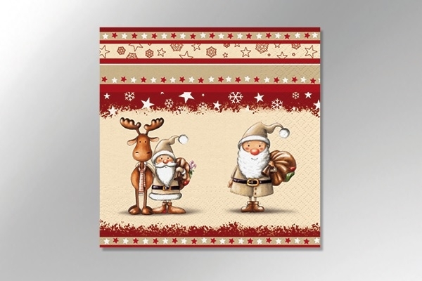 Auf der cremefarbenen Weihnachtsserviette "Secret Santa" befinden sie rote und weiße Sterne. Blickpunt sind zwei Weihnachtsmänner mit Ihrem Rentier.