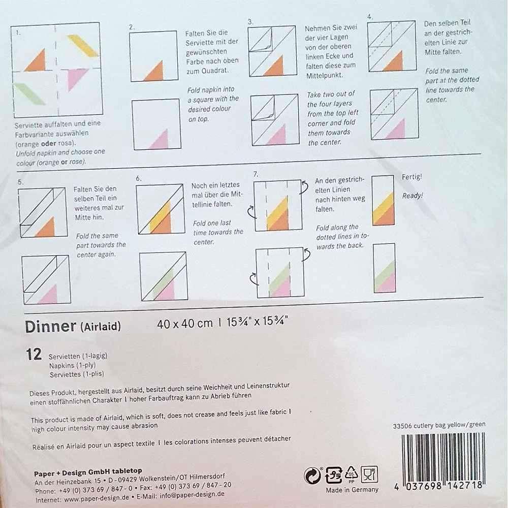 Mit einfachen Handgriffen und einer bebilderten Beschreibung kann aus einer schönen Serviette eine Bestecktasche gefaltet werden. Sie können die Bestecktasche in gelb/orange oder grün/rosa falten.