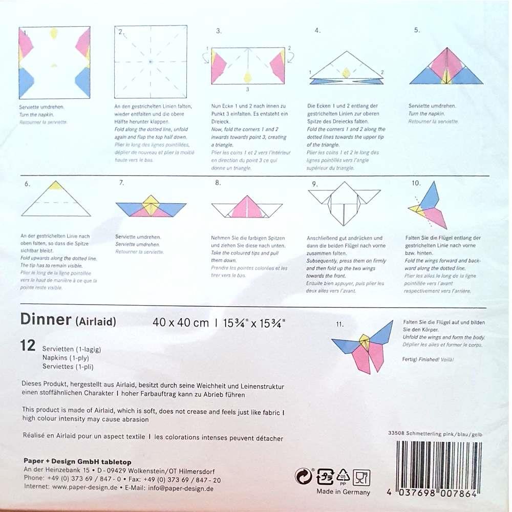 Mit einfachen Handgriffen und einer bebilderten Beschreibung kann aus einer schönen Serviette ein farbenfroher Schmetterling in pink, balu und gelb gefaltet werden. Mit dieser tollen stoffähnlichen Schmetterlingsserviette können Sie die Tischdekoration bei Ihrer nächsten Sommerparty hübsch und elegant aufpeppen.