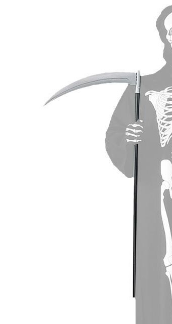 Eine ca 110 cm lange kunststoff Sense mit einem silberfarbenen Messer und einem schwarzen Stiel.