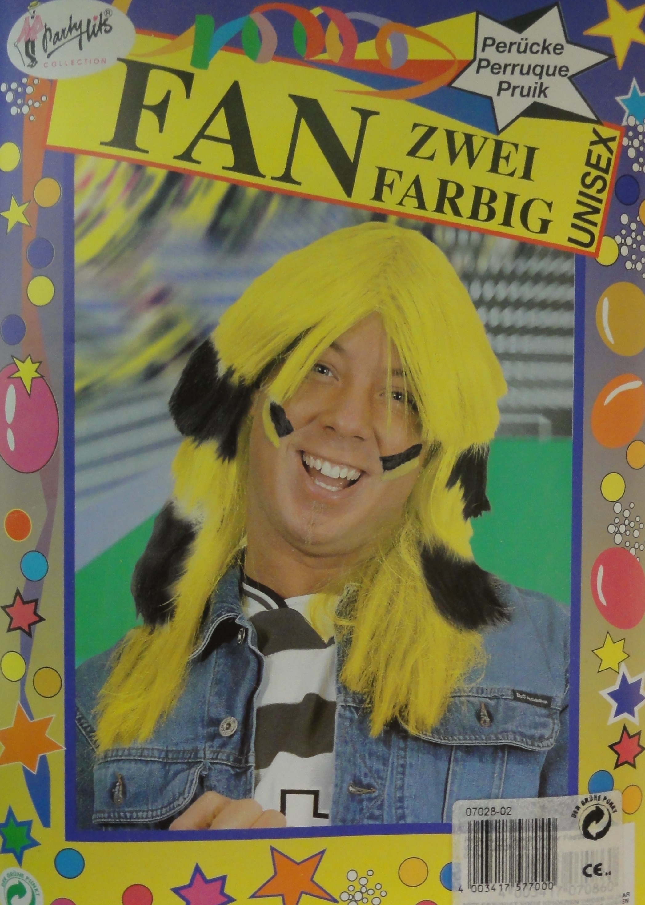 Die schwarz/gelbe Fanperücke können Sie auf Fußballevents oder ähnlichen Veranstaltungen tragen oder suchen Sie noch eine Perücke zu Ihrem Bienenkostüm. Durch den Haarstil können Sie mit dieser Perücke auch auf eine 80er-Jahre-Party gehen.