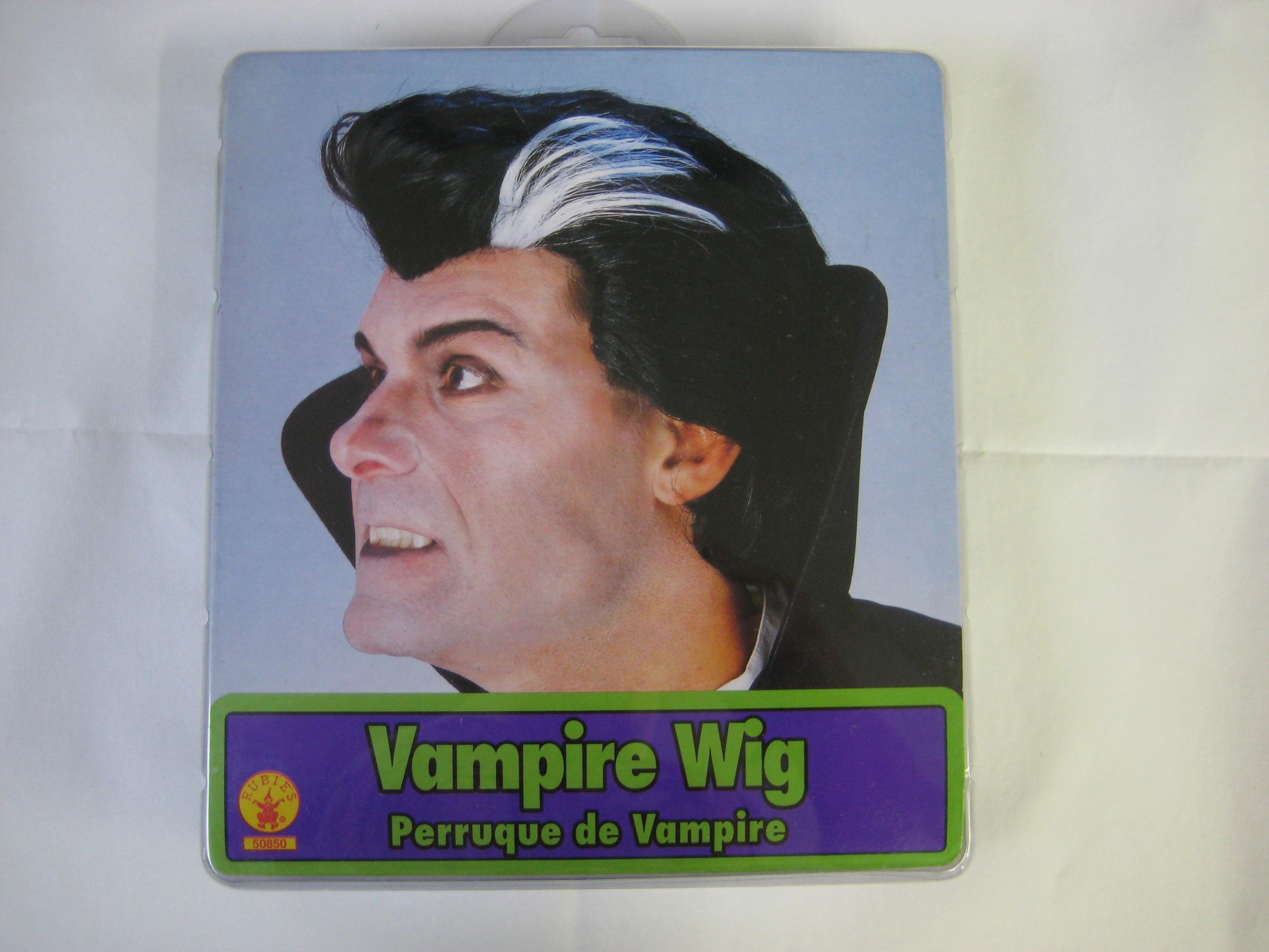 Bei dieser Herren-Vampir-Perücke sind die Haare streng nach hinten gekämmt. Die Perücke ist schwarz und läuft vorne spitz zu. An den Seiten befinden sich 2 weiße Strähnen.