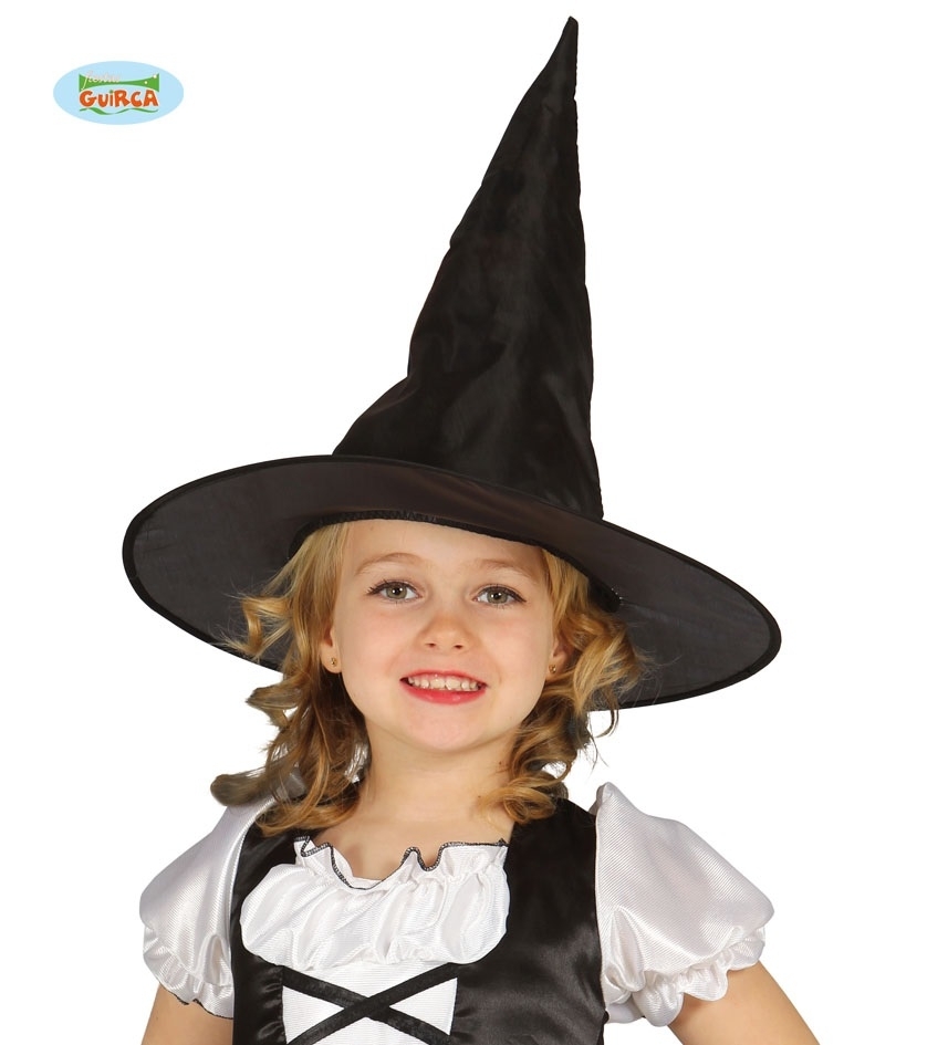 Der schwarze Hexenhut für Kinder ist spitz und passt zu fast allen Hexenkostümen.