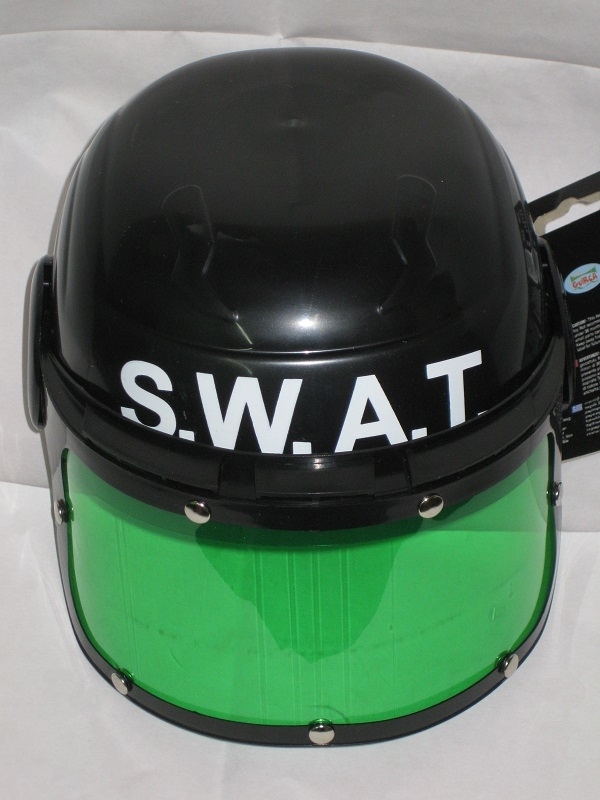 Auf dem schwarzen SWAT-Helm aus Kunststoff befindet sich der weiße Schriftzug S.W.A.T. Das grüne Visier kann herunter geklappt werden.