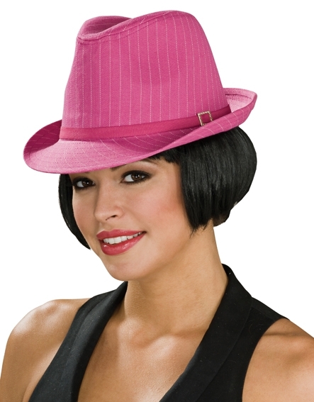 Der helllila Damenhut hat ein pinkes angedeutetes Hutband mit einer Strassschnalle. Dieser Hut passt nicht nur der Gangsterbraut.