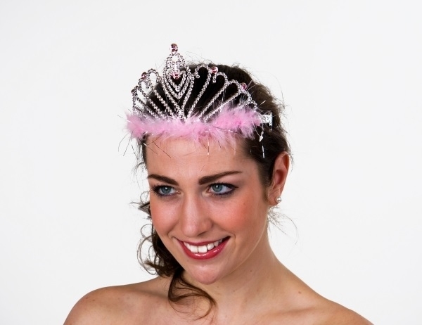 Das silberfarbende Diadem mit rosa Federbesatz passt nicht nur zum Prinzessinnenkleid, sondern kann auch von der Braut prima bei einem Junggesellinnenabschied getragen werden.