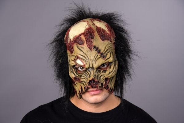 Schaurig, ekelig sieht diese Halloweenhalbmaske aus. Der Dämon hat mehrere offene Stellen, eine verweste Nase und Narben. Igitt! Es handelt sich um eine Halbmaske, d.h. der Mund bleibt frei. Vorteil: Essen und Trinken ist so ungehindert gewährleistet. Die Maske ist aus weichem Material, nicht aus hartem Plastik. Die anhängenden Haare verdecken auch den Hinterkopf.
