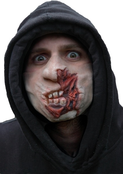 Diese Halbmaske wird mit einem Latexband über den Kopf befestigt. Das diese Maske sehr groß, ist empfehlen wir diese nicht für kleine Köpfe. Eine Verkleidung mit Kapuze hat den Vorteile, dass man das Latexband nicht sieht.