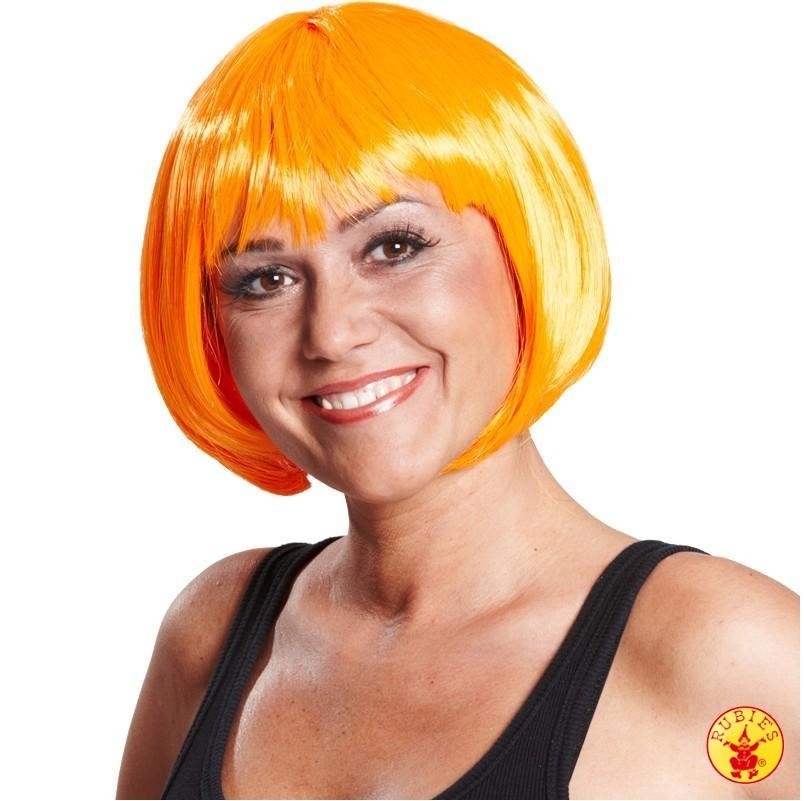 Der neonorangefarbener Pagenkopf für Damen ist orange und passt besonders gut auf eine 80er-Jahre-Party.