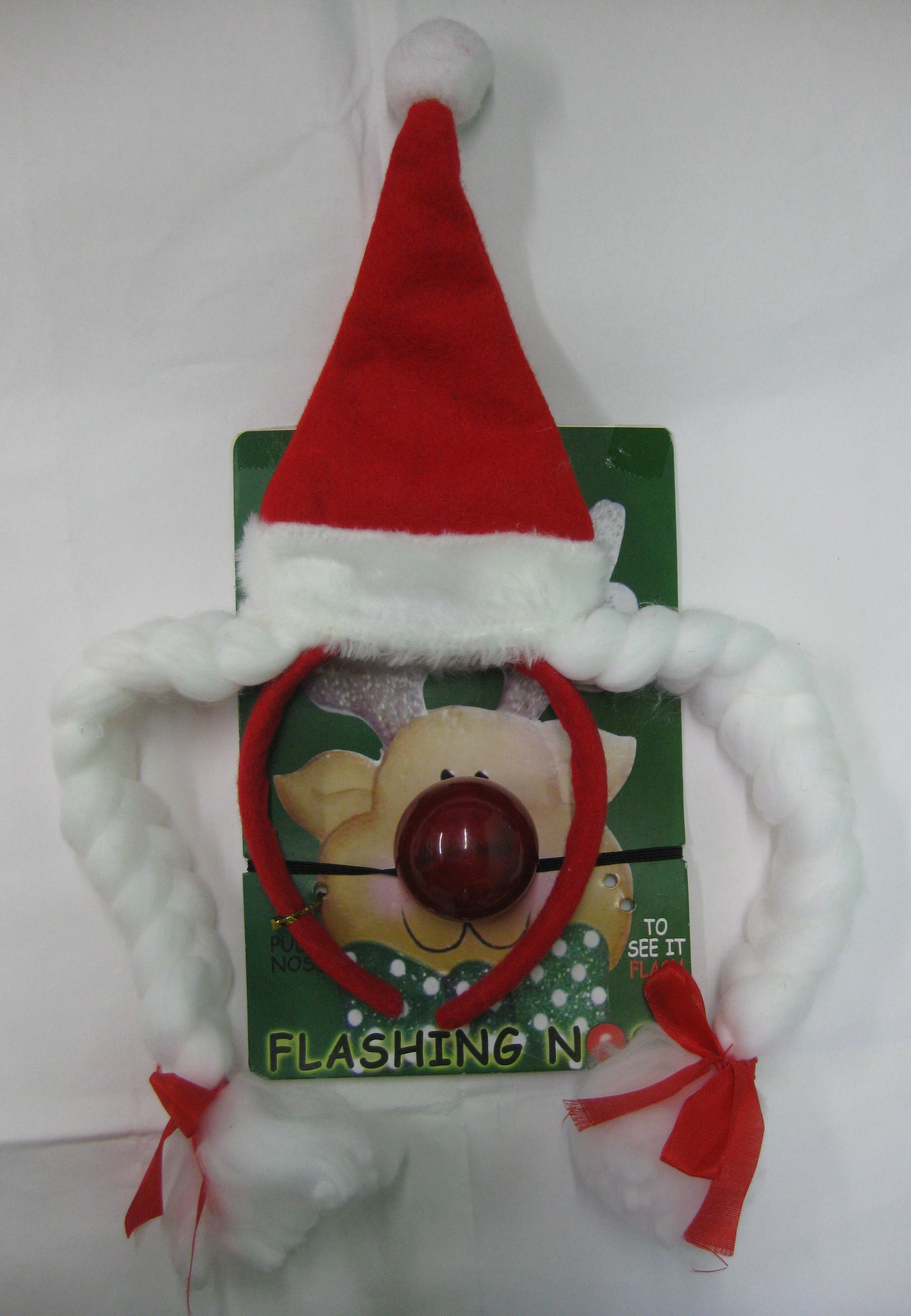 Sie suchen eine witzige Weihnachtsmannmütze für den Weihnachtsmarkt oder für eine Karnevalsverkleidung, dann können wir Ihnen diesen Haarreifen mit Nikolausmütze und Zöpfen empfehlen. An einem roten Haarreifen befindet sich ein kleine Nikolausmütze mit weißen geflochten Gretchenzöpfen und roter Schleife. Dazu gehört eine rote Clownnase, die beim Ziehen einmal aufblinkt.