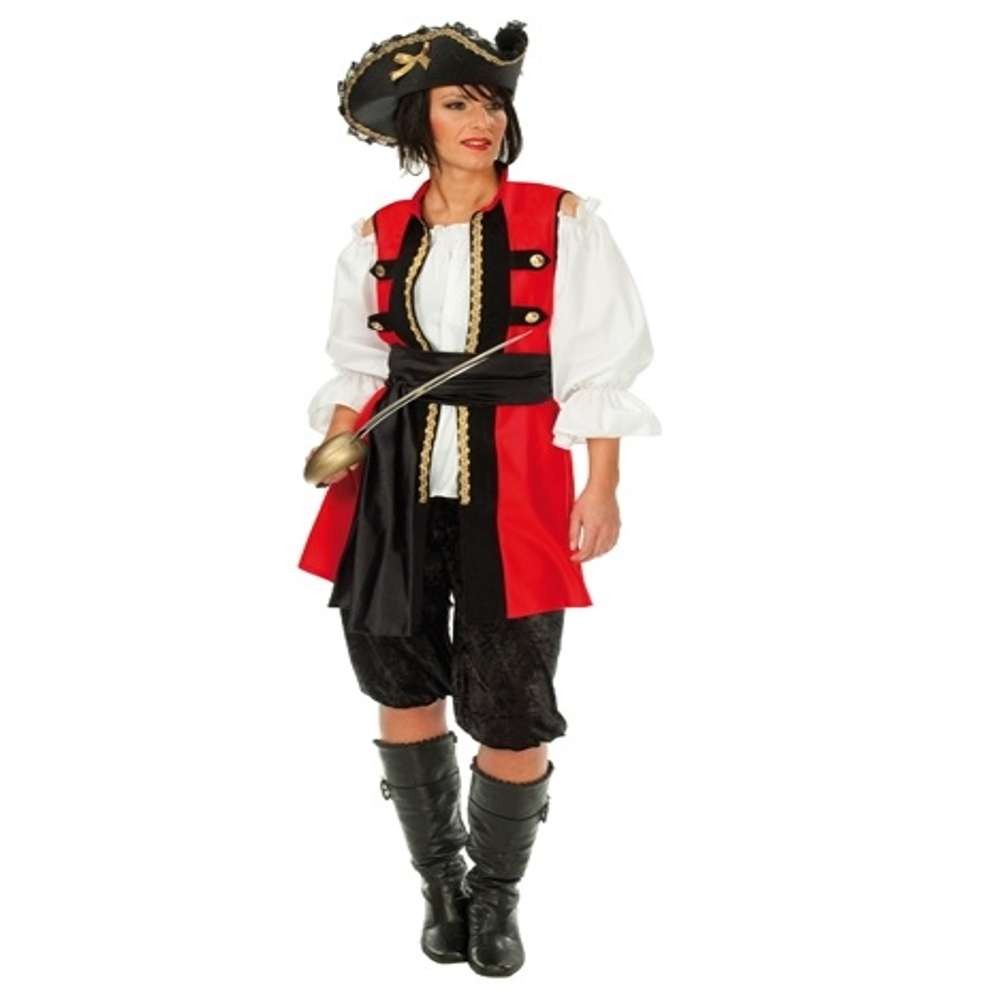 Das Karnevalskostüm "Edelpiratin" besteht aus Jacke, Kniebundhose und Gürtel. Die Kniebundhose wurde aus schwarzem Pannesamt hergestellt. Am Bauchbund sowie an den Knieen befindet sich ein Gummizug. Die Jacke ist etwas länger gearbeitet die vordere Seite wurde ca. 5 cm breit schwarz abgesetzt. In Brusthöhe befinden sich bis zum Kragen gelb-goldene Paspel. Vier dicke goldfarbene Knöpfe runden das Gesamtbild ab. Mit einem schwarzen Band können Sie diese Jacke schließen. Achtung: Die Bluse und der Hut gehören nicht mit zum Lieferumfang. Zu diesem Karnevalskostüm finden Sie bei uns auch Zubehör.Den Piratenbeutel können wir Ihnen empfehlen, um Ihre Utensilien zu verstauen.