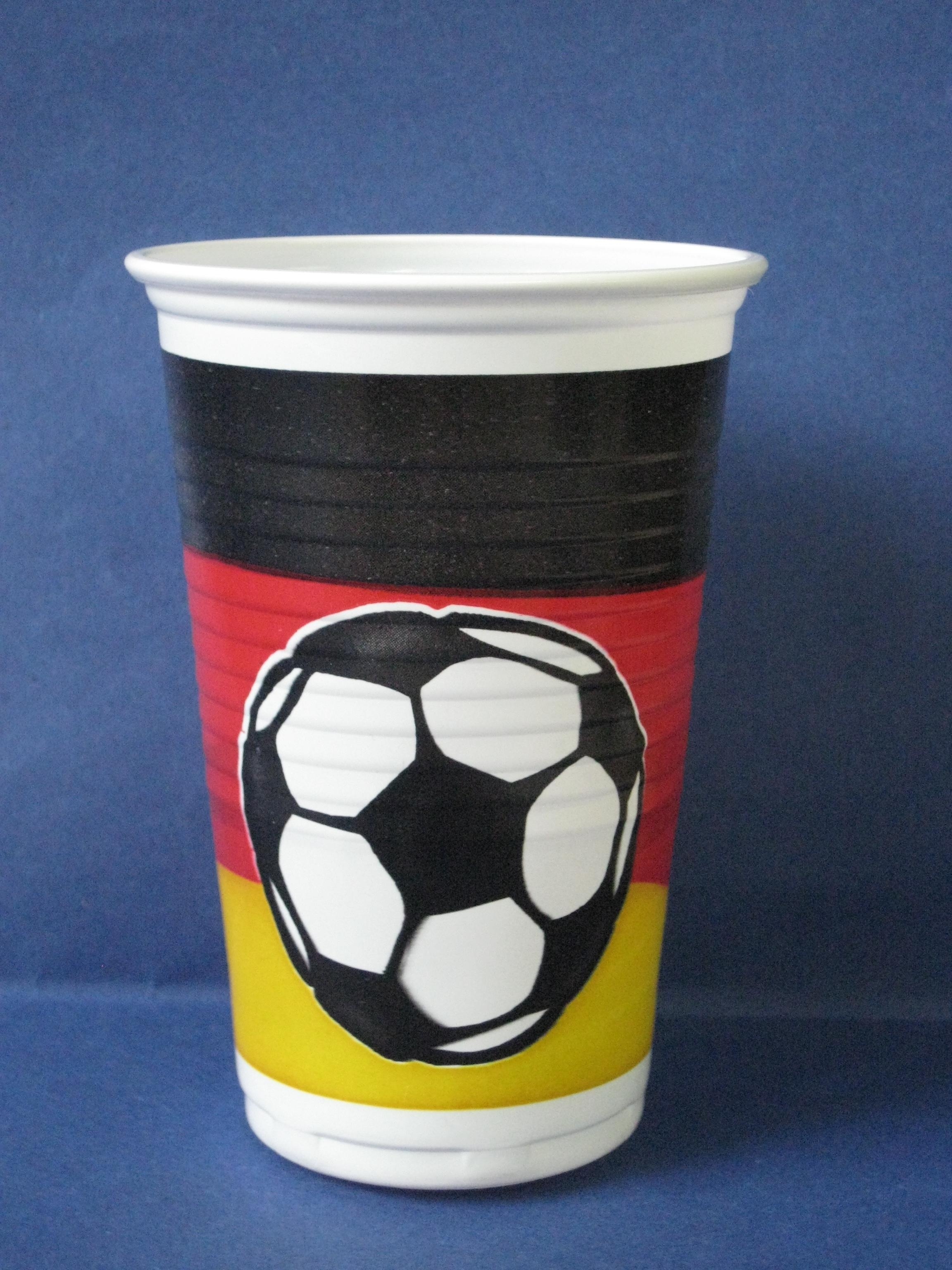 Egal ob zur Weltmeisterschaft, beim Grillen oder zum Kindergeburtstag. Auf dem schwarz, rot, gelben Trinkbecher befinden sich zwei Fußbälle. Der Trinkbecher aus Kunststoff ist 13,5 cm hoch und hat einen oberen Durchmesser von 7 cm - Fassungsvermögen: 0,2 l