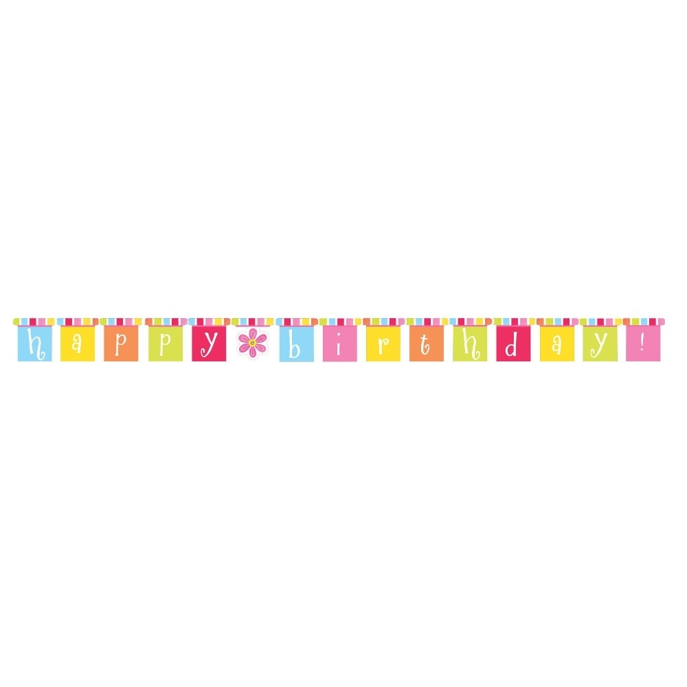 Auf jedem Pappschildchen befindet sich ein Buchstabe, so das sich der Schriftzug Happy Birthday ergibt. Der obere Rand der Schildchen ist mit grünen, blauen, roten, pinken und gelben Streifen verziert. Der Happy Birthday-Banner ist 2,67 m lang, ein Schildchen ist 14 x 14 cm groß.