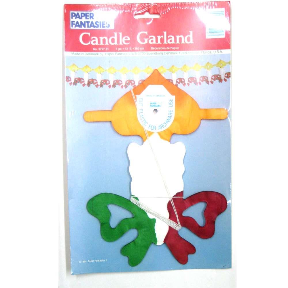 Diese Papier-Girlande ist 3,60 m lang und wie eine Kerze geformt. Im unteren Bereich befinden sich aus Papier gestanzt rote und grüne Schleifen, gefolgt von einder weißen Kerze abschließend eine gelbe Flamme.